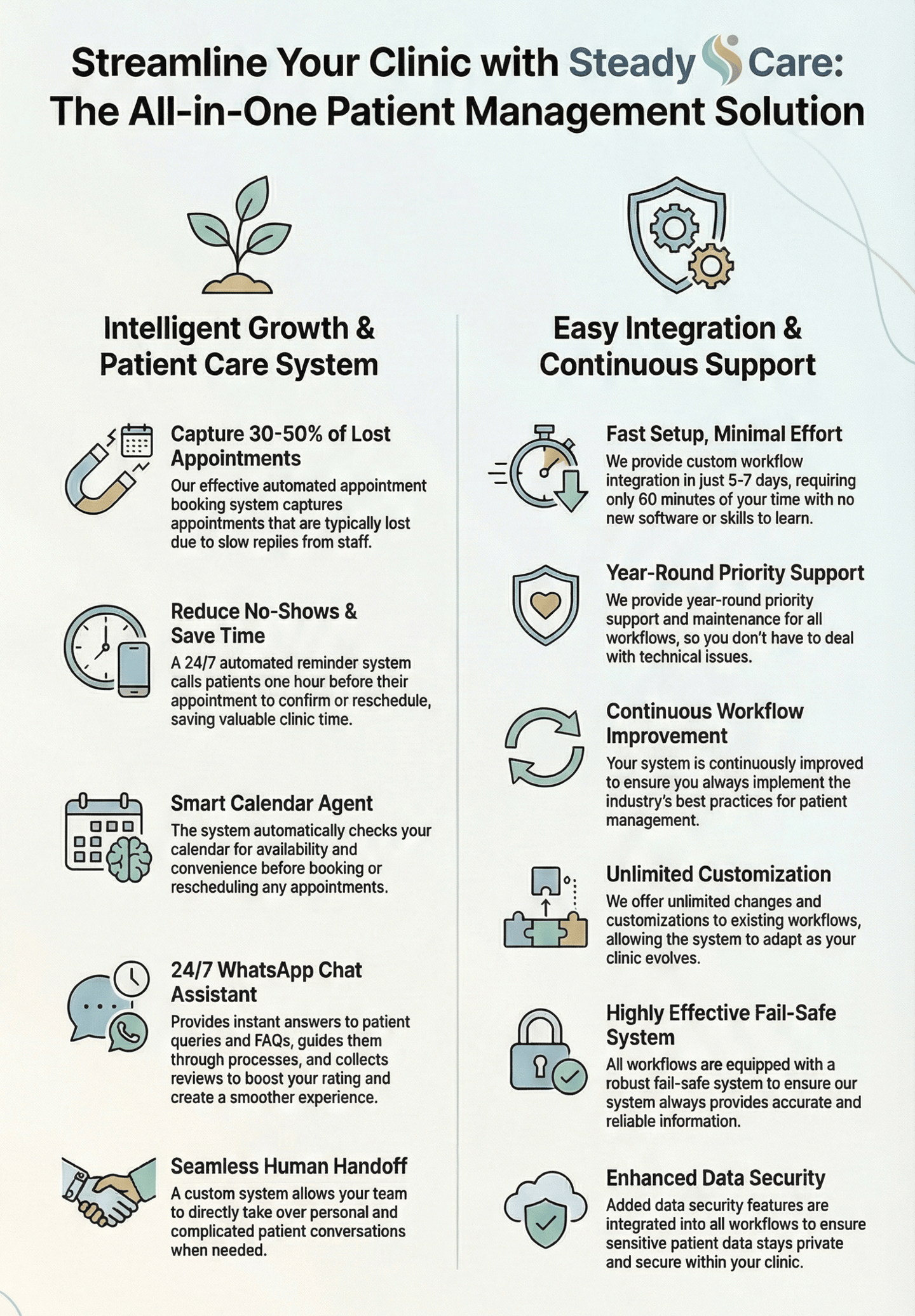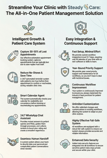 Steady Care is designed not to replace your front desk team, but to act as their 24/7 assistant. We enhance efficiency by handling high-volume, repetitive tasks like instant replies and basic appointment bookings, particularly capturing the majority of missed enquiries that occur after hours. This frees your team to focus on providing high value personalized patient care.